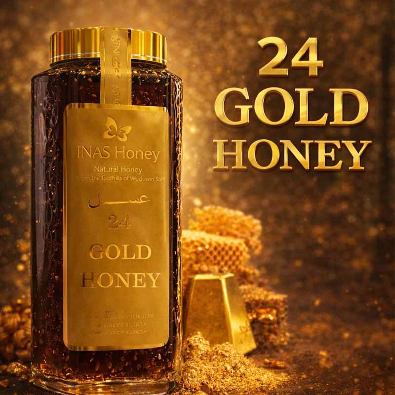 Luxurious Inas Premium Gold Honey, 750g jar – pure honey infused with 24K gold flakes, rich, aromatic, and perfect for wellness and gifting.